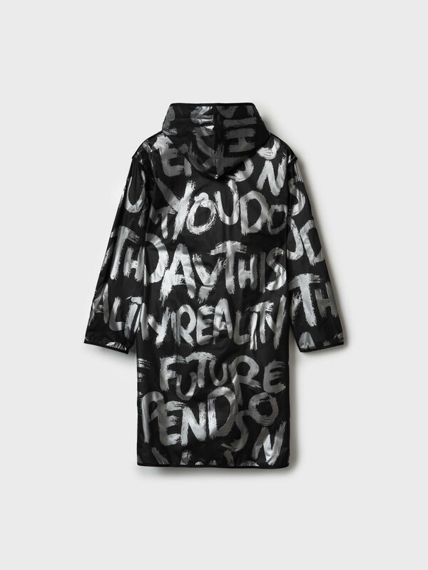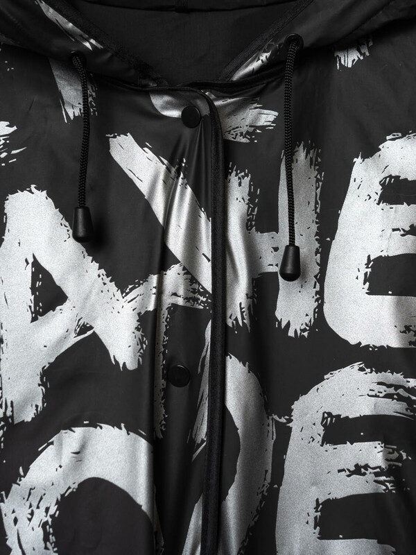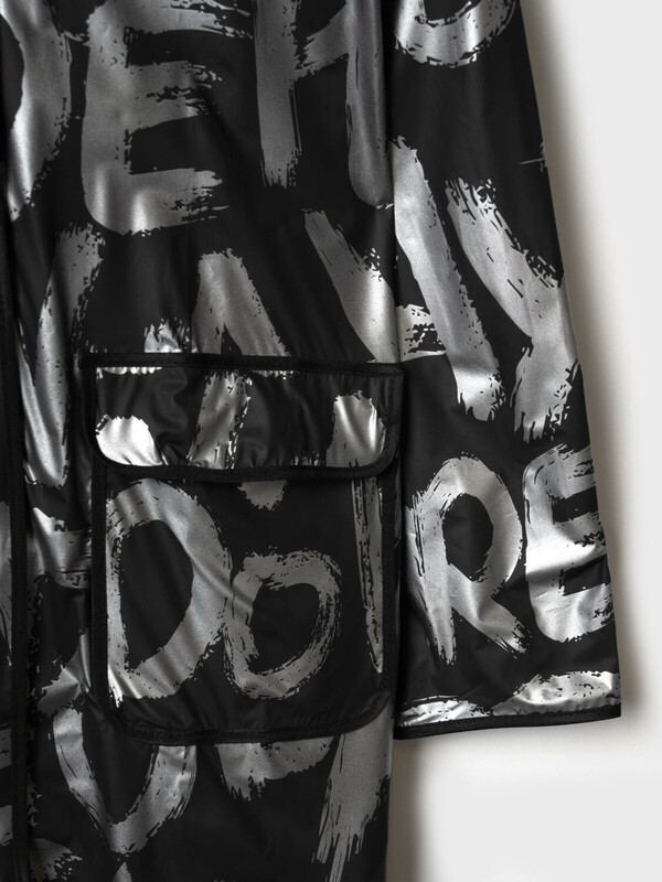 Укороченный плащ-дождевик для девочки-подростка с серебряным шрифтовым принтом в коллекцию. Капюшон с утяжкой. Застежка на кнопки. Материал ЭВА. Без подкладки. Модель имеет спереди два накладных кармана с клапаном. Добавлена петелька под капюшоном с внешней стороны, чтобы остальные вещи на вешалке не намокали. Сзади есть светоотражающая полоска. Идеально подходит для парного образа мама-дочь, так как такая модель есть в размерах для взрослых. В комплекте идет непромокаемая сумочка.