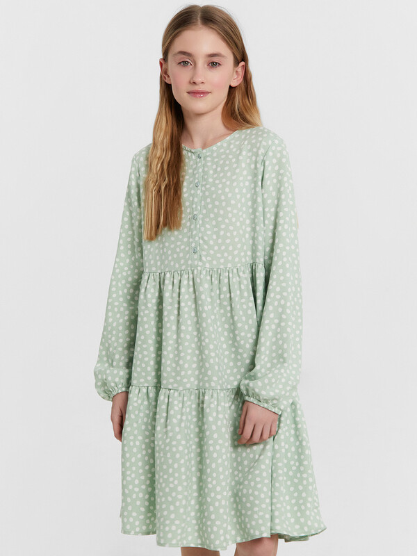 Красивое детское платье для девочек в классическом А-силуэте с отрезными воланами. Эта модель из 100% вискозы сочетает в себе изящество и шарм, создавая идеальную гармонию стиля. По переду платья расположена застежка-планка, состоящая из четырех элегантных пуговиц. Горловина платья выполнена в форме круглого выреза. Длинные втачные рукава придают платью элегантность и изысканность. Такое платье станет идеальным выбором на каждый день и для праздников. Оно подчеркнет индивидуальность вашей девочки, а его оригинальный дизайн не оставит равнодушными окружающих. Рекомендуем!