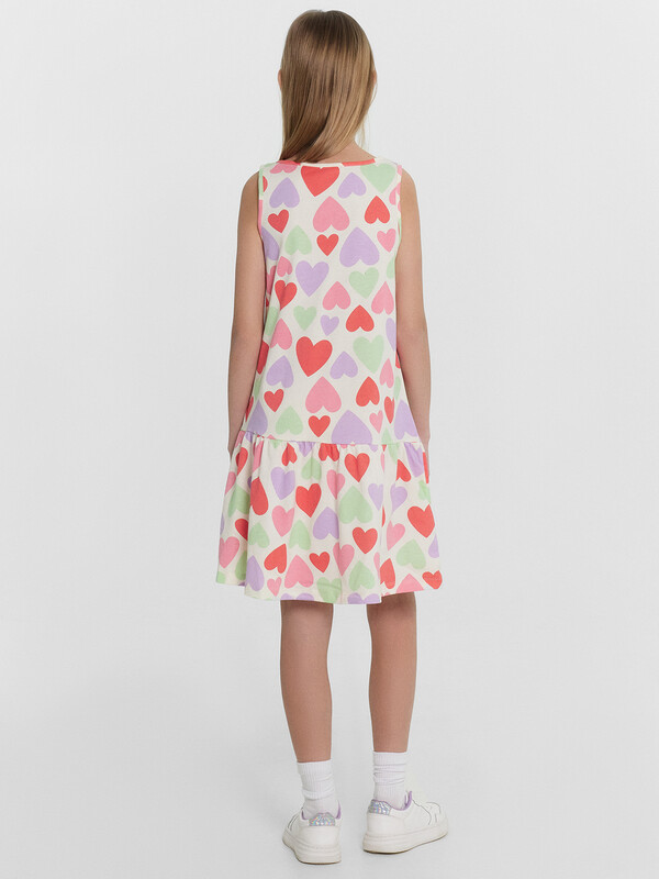 Сарафан для девочек А-силуэта с отрезным воланом по низу. Длина немного выше колена. Горловина круглая. Проймы и горловина окантованы бейкой из основного полотна. Низ изделия обработан швом в подгибку.