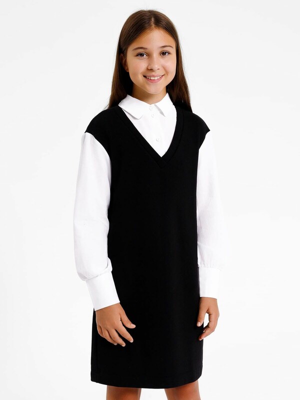 Селаник. Платье свободного силуэта, с имитацией жилетки и рубашки. Жилет-платье из селаника горловина V-образной формы. Рубашка из ткани горловина круглой формы, воротник с цельнокроенной стойкой. По переду центральная застежка на пуговицы. Плечо спущено, пройма углубленна. Рукава втачные, длинные из ткани. Низ рукава немного расширен и присборен, по низу рукава отрезная манжета из ткани. Платье длиной выше колена.