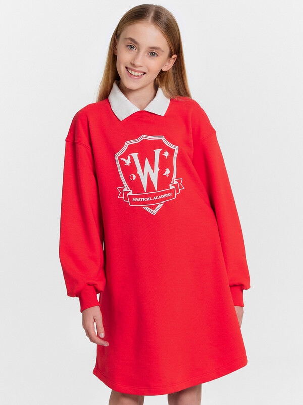 Платье свободного силуэта. Перед и спинка цельнокроеные. Горловина круглой формы c окантовкой из трикотажного полотна рибаны. В горловину втачан вязаный воротник, шов втачивания закрыт х/б тесьмой. Рукава длинные, втачные. Линия плеча спущена. По низу рукавов притачные манжеты из трикотажного полотна рибаны. Низ изделия фигурный, обработан на 2-х игольной