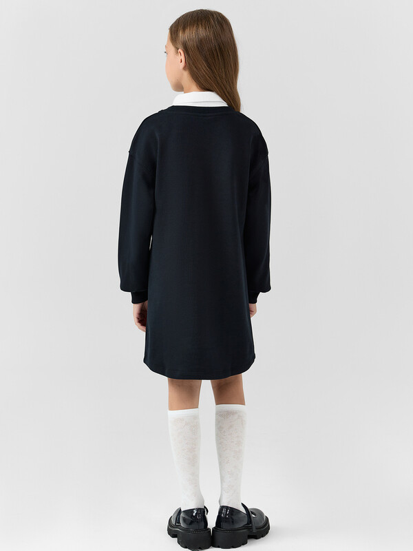 Платье свободного силуэта. Перед и спинка цельнокроеные. Горловина круглой формы c окантовкой из трикотажного полотна рибаны. В горловину втачан вязаный воротник, шов втачивания закрыт х/б тесьмой. Рукава длинные, втачные. Линия плеча спущена. По низу рукавов притачные манжеты из трикотажного полотна рибаны. Низ изделия фигурный, обработан на 2-х игольной