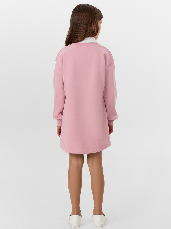 Платье свободного силуэта. Перед и спинка цельнокроеные. Горловина круглой формы c окантовкой из трикотажного полотна рибаны. В горловину втачан вязаный воротник, шов втачивания закрыт х/б тесьмой. Рукава длинные, втачные. Линия плеча спущена. По низу рукавов притачные манжеты из трикотажного полотна рибаны. Низ изделия фигурный, обработан на 2-х игольной