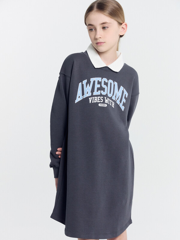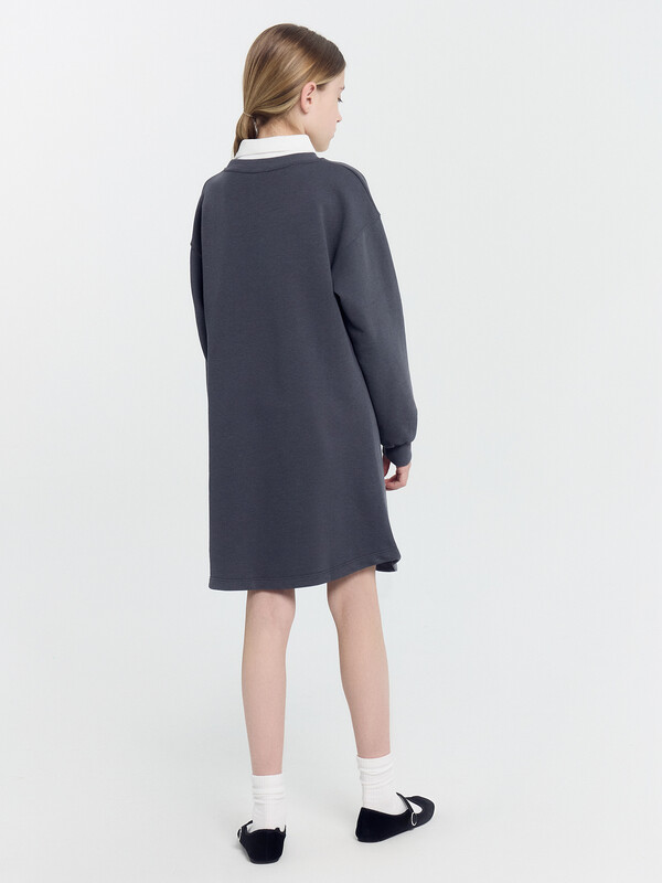 Платье свободного силуэта. Перед и спинка цельнокроеные. Горловина круглой формы c окантовкой из трикотажного полотна рибаны. В горловину втачан вязаный воротник, шов втачивания закрыт х/б тесьмой. Рукава длинные, втачные. Линия плеча спущена. По низу рукавов притачные манжеты из трикотажного полотна рибаны. Низ изделия фигурный, обработан на 2-х игольной