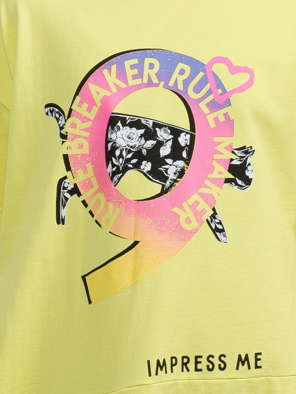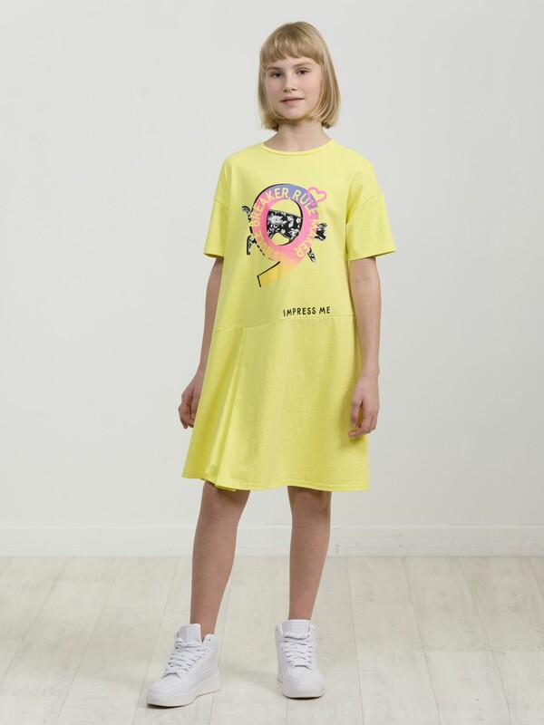 Платье А силуэта с заниженной линией талии, диагональным членением и двумя односторонними складками. Стойкий неоновый принт. Перевод Тот, кто создает правила. Тот, кто нарушает правила. и Впечатли меня.