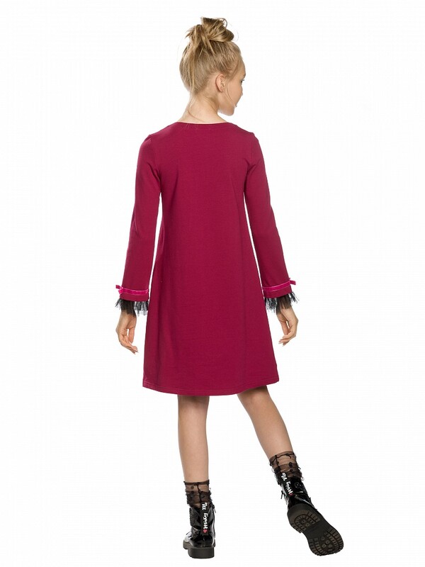 Платье для девочек. Новинка кроя! Платье из эластичного футера, силуэт-трапеция: в верхней части более прилегающее, к низу более расширенное. Облегающие рукава вверху, расширяются к низу; по низу рукавов плиссированная сетка с настроченной бархатной лентой и бантиком; декоративный центральный шов по переду изделия.