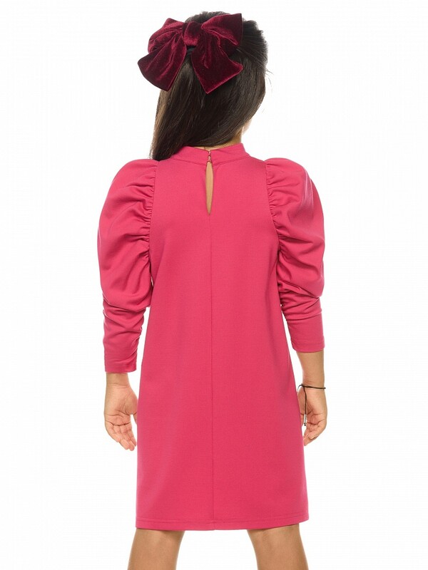 Нарядное платье, слегка расширенное к низу. Горловину украшает изящная стойка, застёжка на две пуговицы по спинке. Фишка платья в пышных рукавах, объём которых достигнут за счет густой сборки оката. Сборка рукава по внутреннему шву на эластик позволяет регулировать длину. Перед декорирован сказочным принтом с серебряным металликом и пайетками.