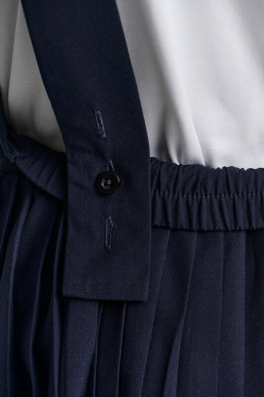 Верх сарафана — жилет с застёжкой на пуговицы спереди. Спинка с перекрещивающимися лямками регулируется по длине, чтобы сарафан идеально сидел на ребёнке любого роста. Лямки крепятся к юбке на потайные пуговицы, что обеспечивает надёжную фиксацию и комфорт при движении.