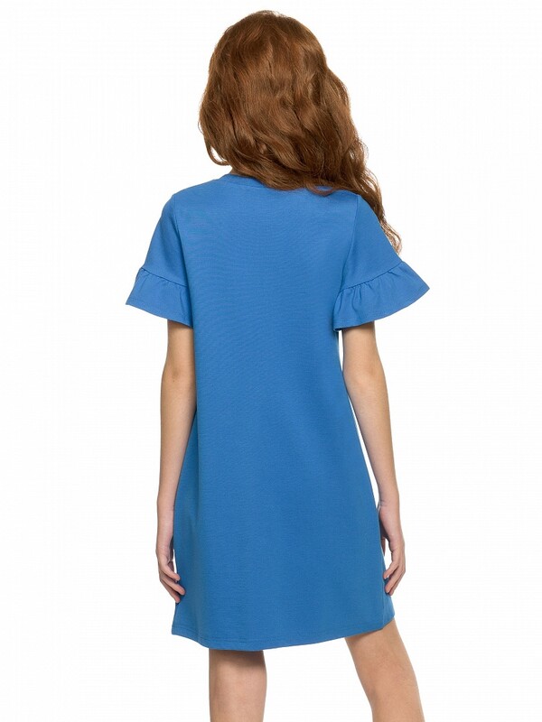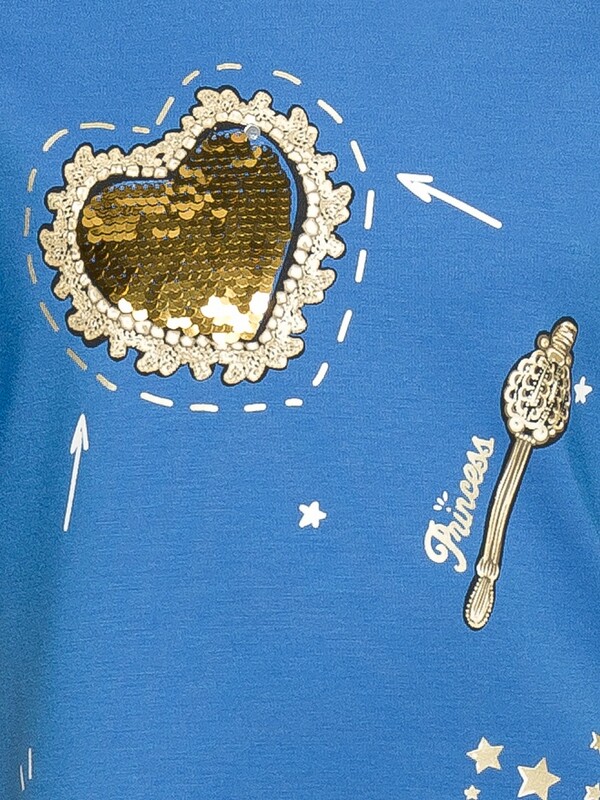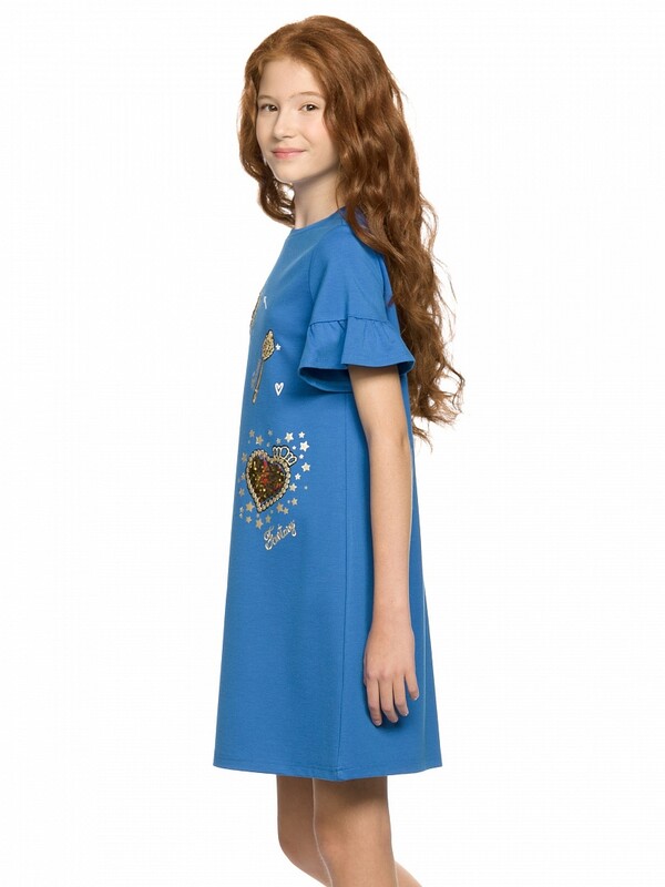 низу которого пришит волан. Перед платья декорирован принтом, имитирующим объемную вышивку. Сердечки в принте из двусторонних пайеток и золотистого глиттера.