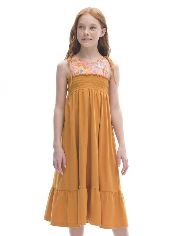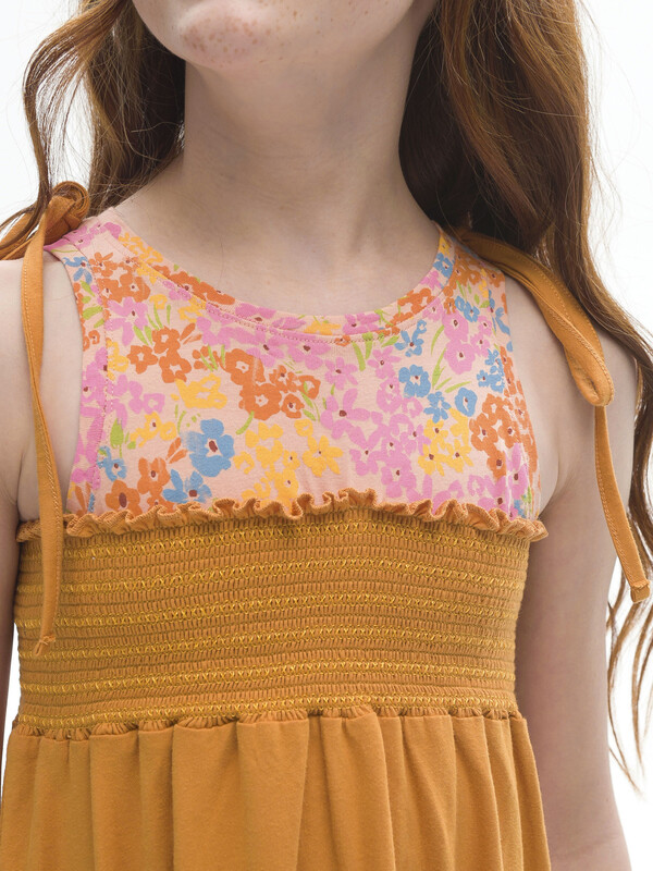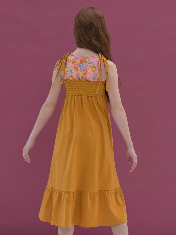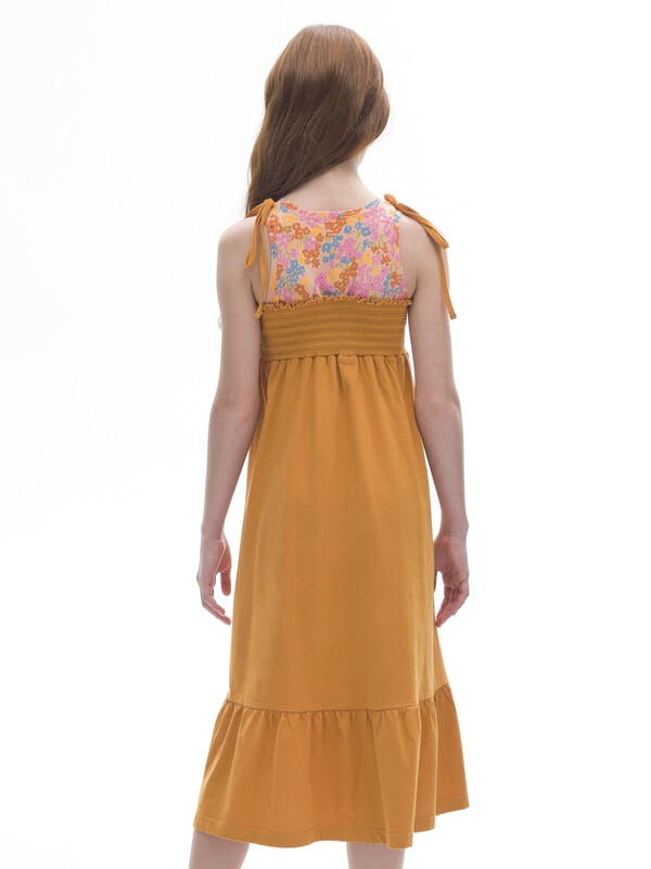 Яркое летнее платье-сарафан длины миди для девочки. Имитация двух изделий, надетых друг на друга. Верхняя часть модели напоминает майку. Нижняя — состоит из лифа с эластичной сборкой и юбки с воланом. Свободный крой и 100% хлопка в составе ткани обеспечивают вашему ребёнку комфорт. Платье не стесняет движений и в нём не жарко. Девочка сможет носить его продолжительное время. Ребёнок растёт —платье словно "растёт" вместе с ним. Декоративная сборка на лифе создаёт актуальную фактуру — один из трендов летнего сезона. Верхняя часть изделия украшена изящным цветочным принтом. На плечах декоративные банты.