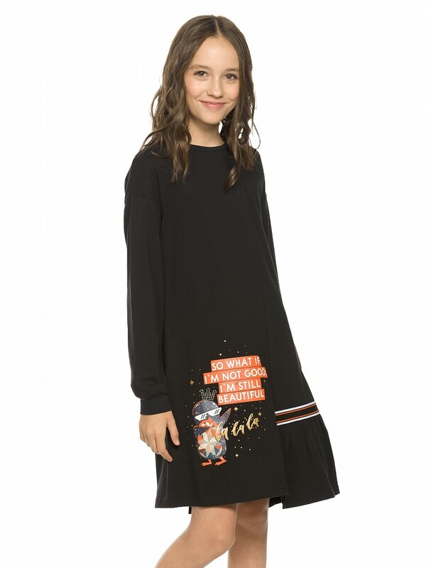 Трикотажное платье спортивного стиля увеличенного объёма с мягким спущенным плечом. Широкий рукав собран на манжету из основной ткани. Асимметричный крой с вертикальным членением по всей длине. По левому нижнему краю притачной волан. Декор эластичная тесьма в полоску. Rubber принт с золотом, глиттером и стразами. Перевод Ну и что, что я не послушная, я все еще красотка.