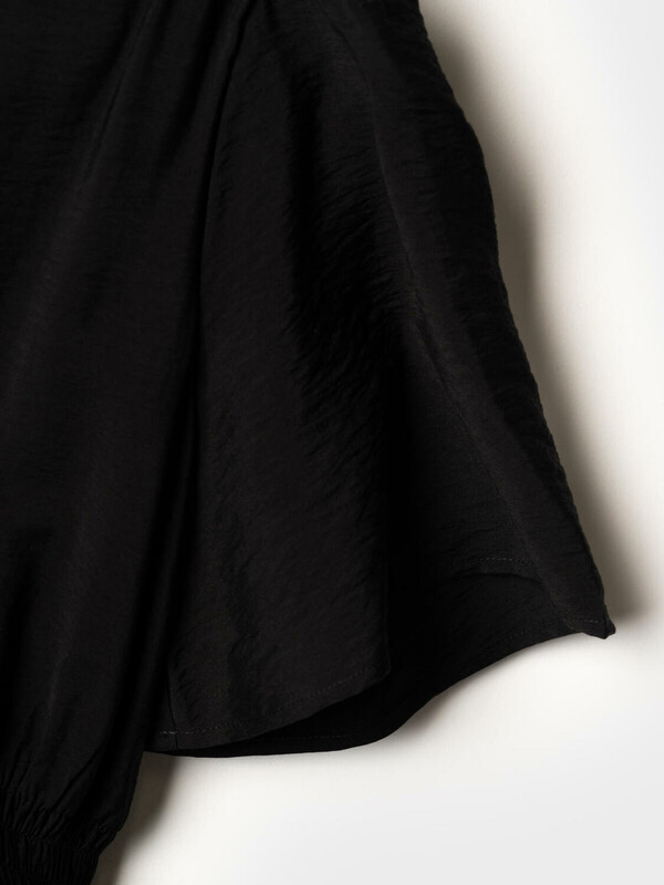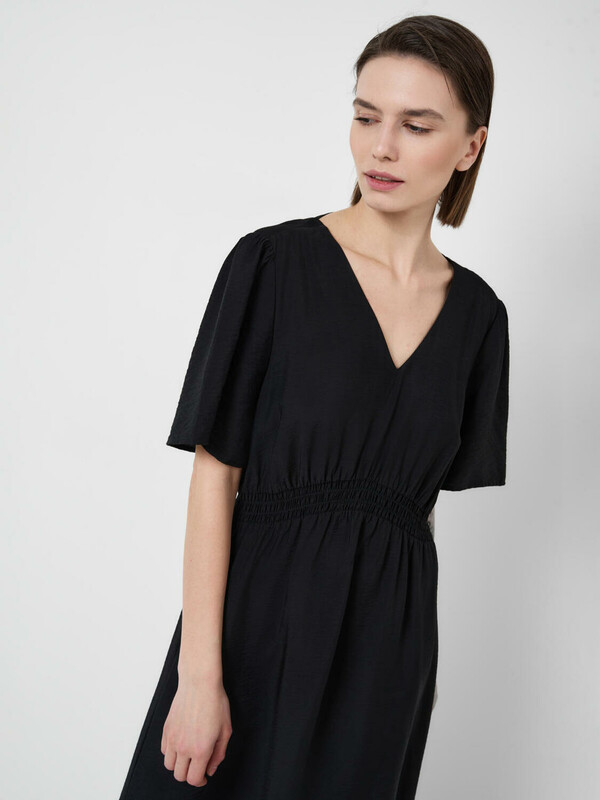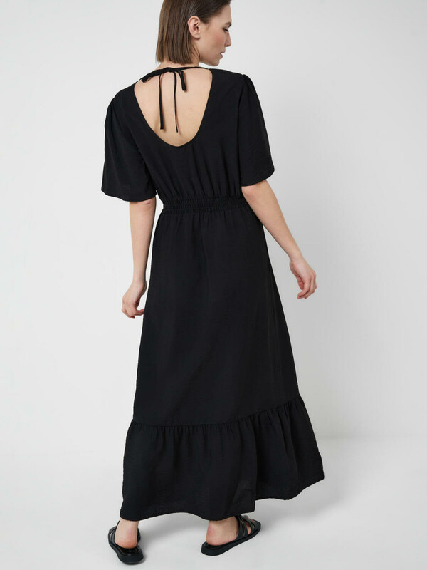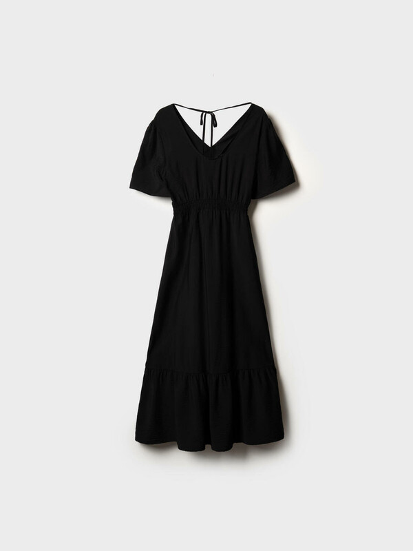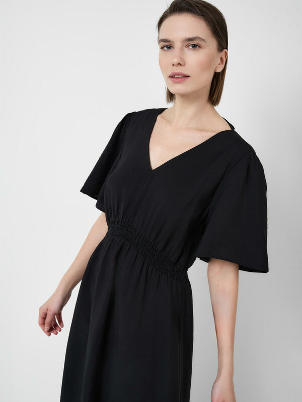 Женское летнее платье миди. Материал — лёгкая вискозная ткань. V-образный вырез спереди и сзади, на спинке предусмотрена декоративная завязка. В талии вшита внутренняя резинка, что обеспечивает комфортную посадку. По низу изделия расположен широкий волан, придающий образу лёгкость и женственность.