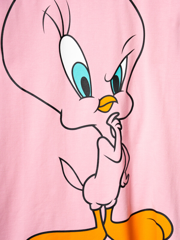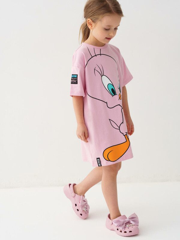 Детское платье-футболка для девочки. Модель чуть выше колена, выполнена из хлопкового трикотажа джерси. Украшена яркими принтами и нашивками с любимым мультяшным персонажем Твити.