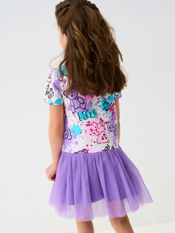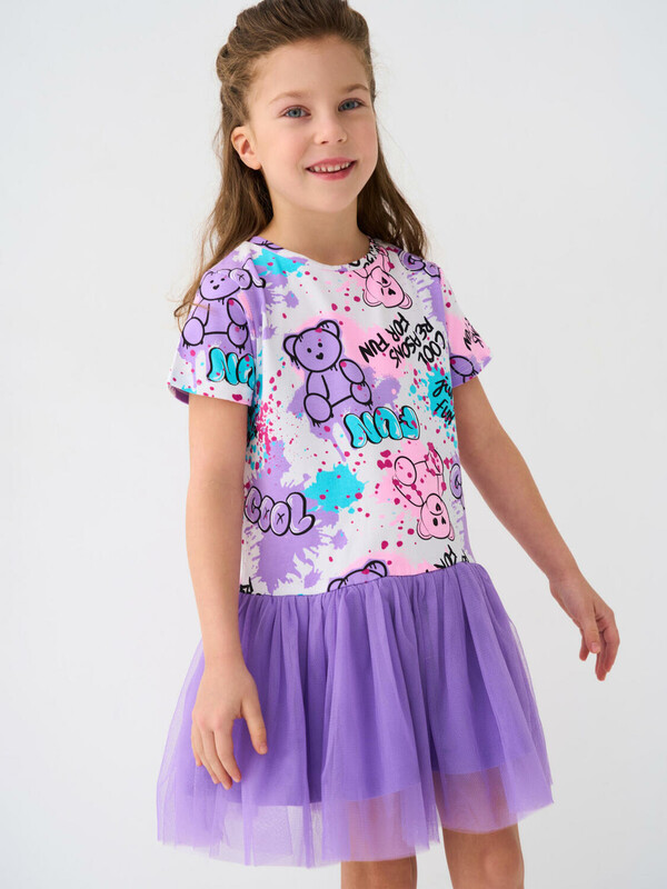 Легкое детское платье для девочки. Модель из комбинации хлопкового трикотажа джерси и сетки. Верх выполнен в виде футболки и украшен ярким принтом в стиле граффити. Пышная юбка из сетки придаёт изделию нарядный вид.