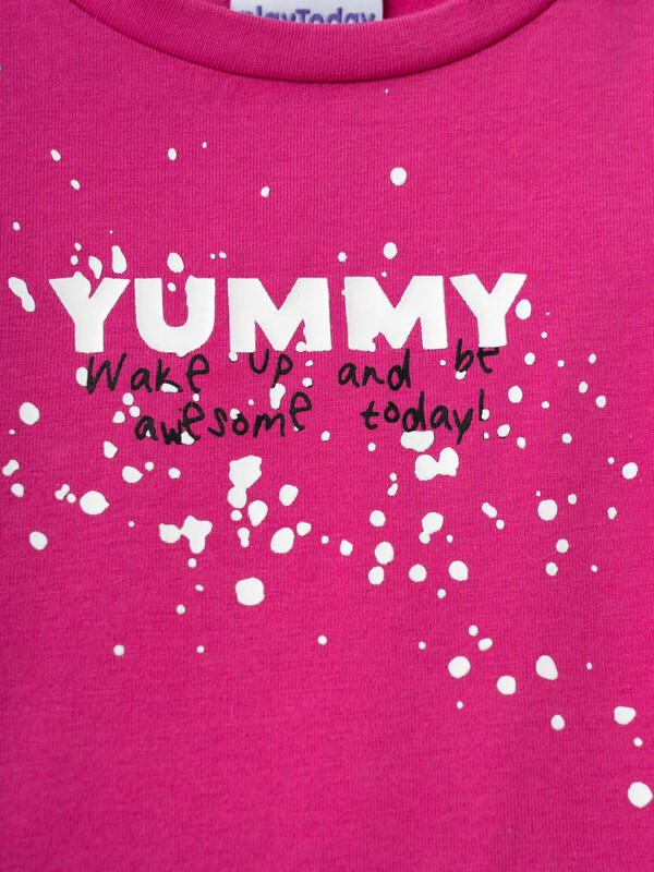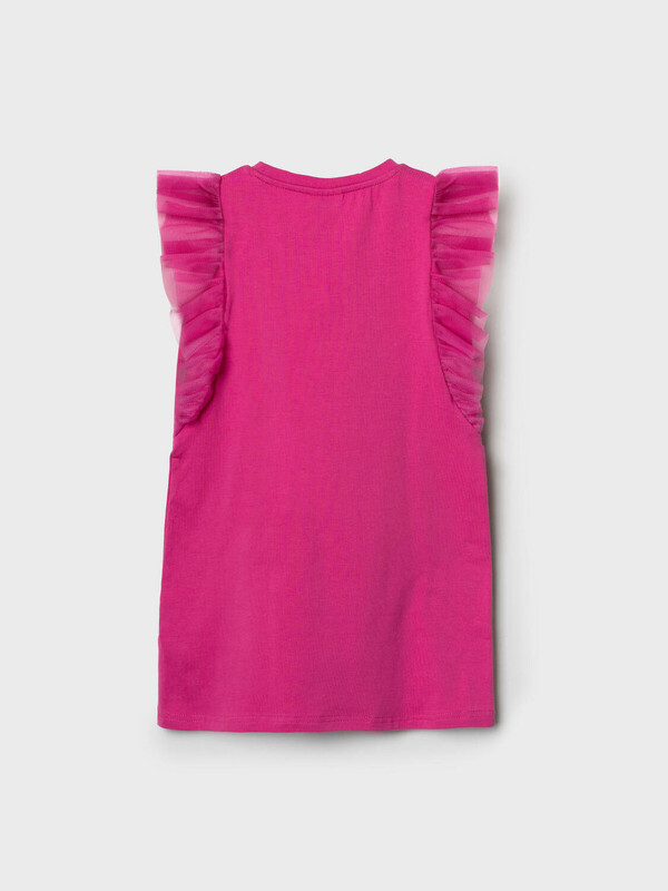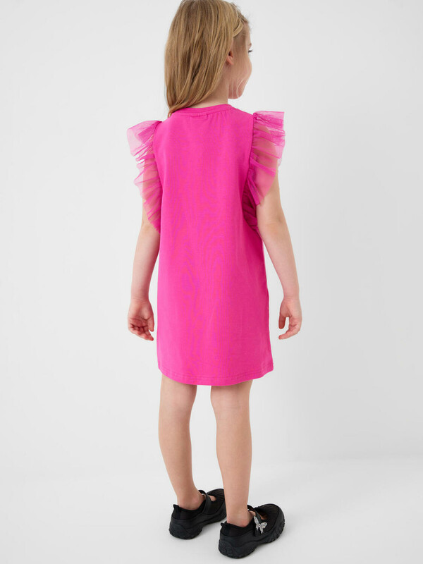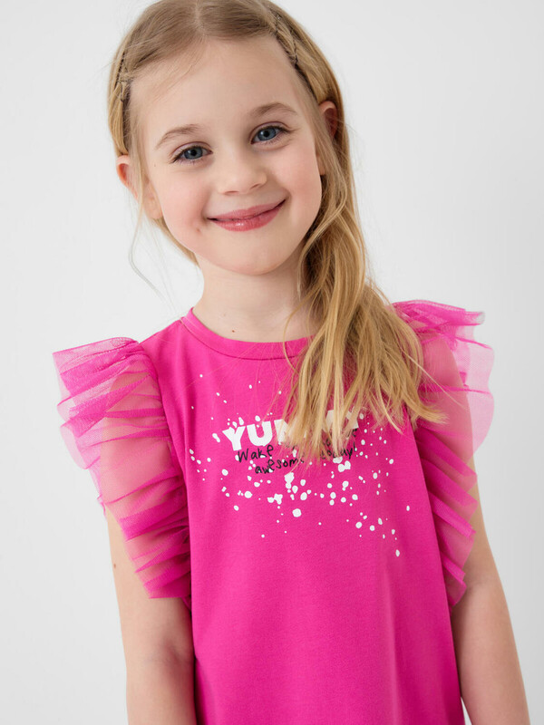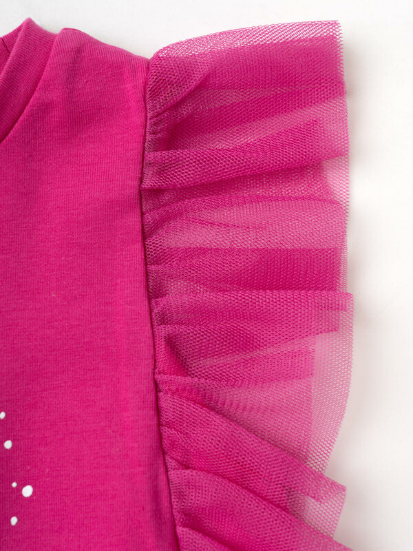 Яркое детское платье для девочки. Выполнено из мягкого хлопкового трикотажа джерси. На груди - красочный принт. По рукавам — декоративные крылышки из лёгкой двухслойной сетки, которые придают образу воздушность. Круглый вырез горловины с аккуратной отделкой. Платье прямого силуэта и укороченной длины — чуть выше колена.