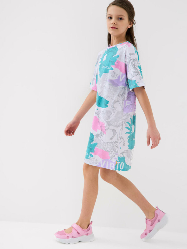 Платье-футболка оверсайз для девочки подростка. Модель длиной чуть выше колена, выполнена из хлопкового трикотажа джерси. Яркие принты.