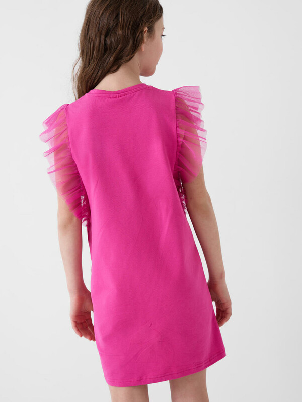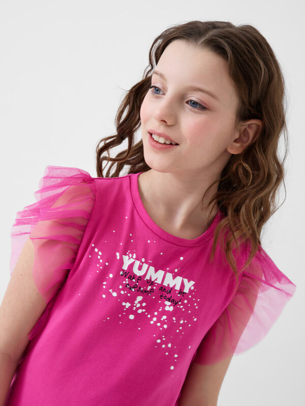 Яркое платье для девочки подростка. Выполнено из мягкого хлопкового трикотажа джерси. На груди - красочный принт. По рукавам — декоративные крылышки из лёгкой двухслойной сетки, которые придают образу воздушность. Круглый вырез горловины с аккуратной отделкой. Платье прямого силуэта и укороченной длины — чуть выше колена.