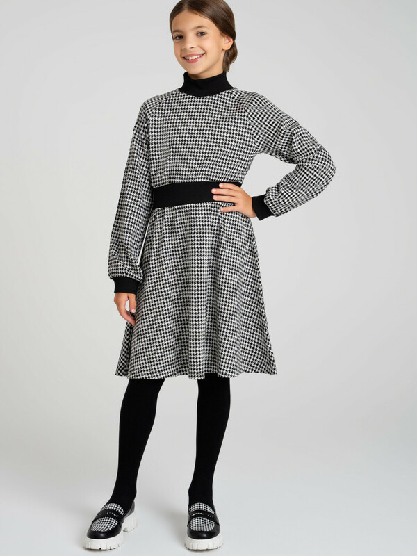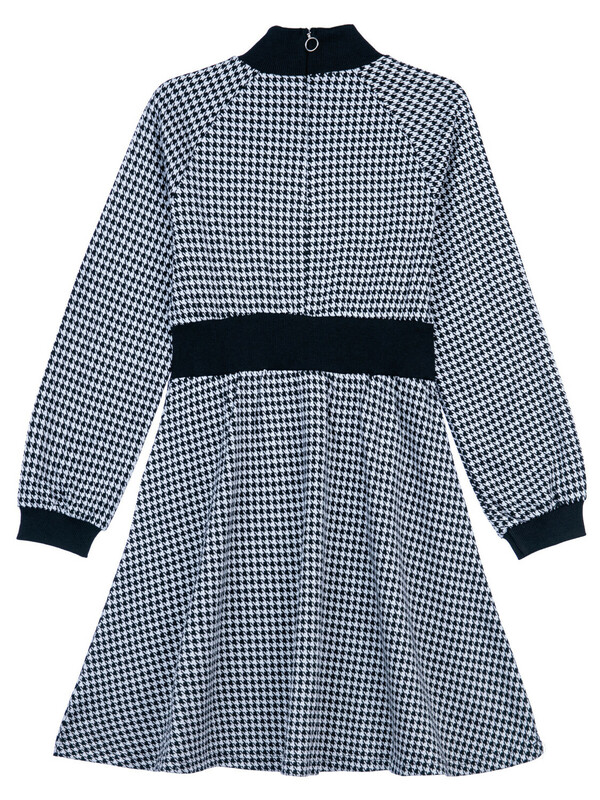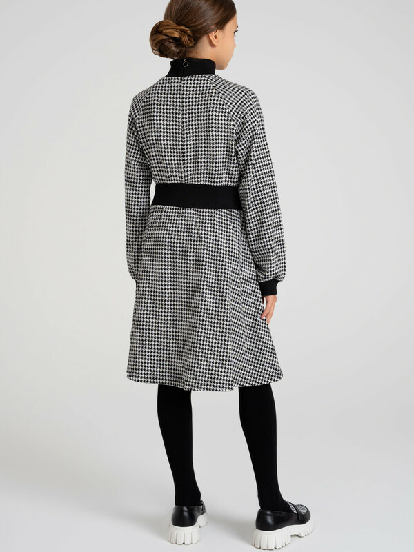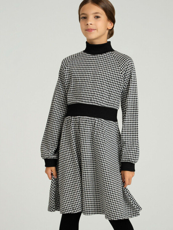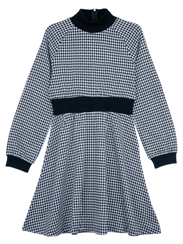Платье из плотного жаккардового трикотажа. Манжеты, горловина и пояс по талии выполнены из эластичного риба.