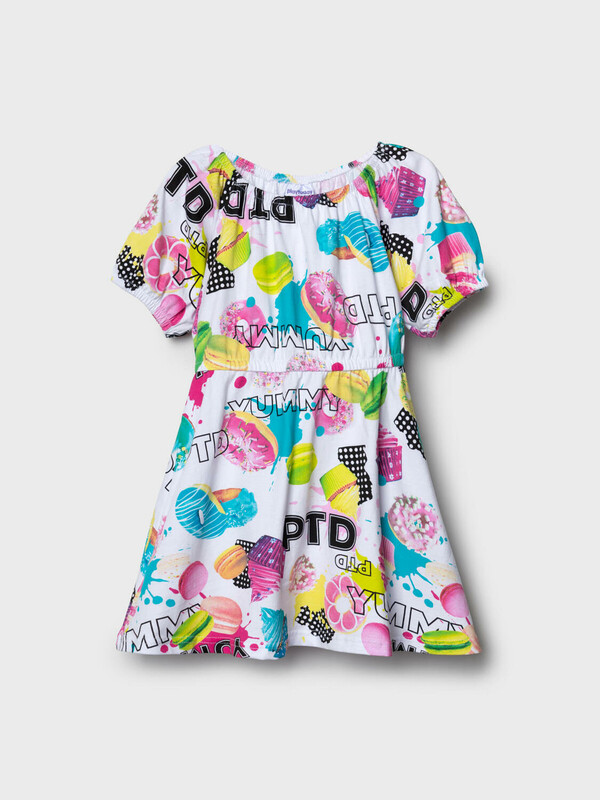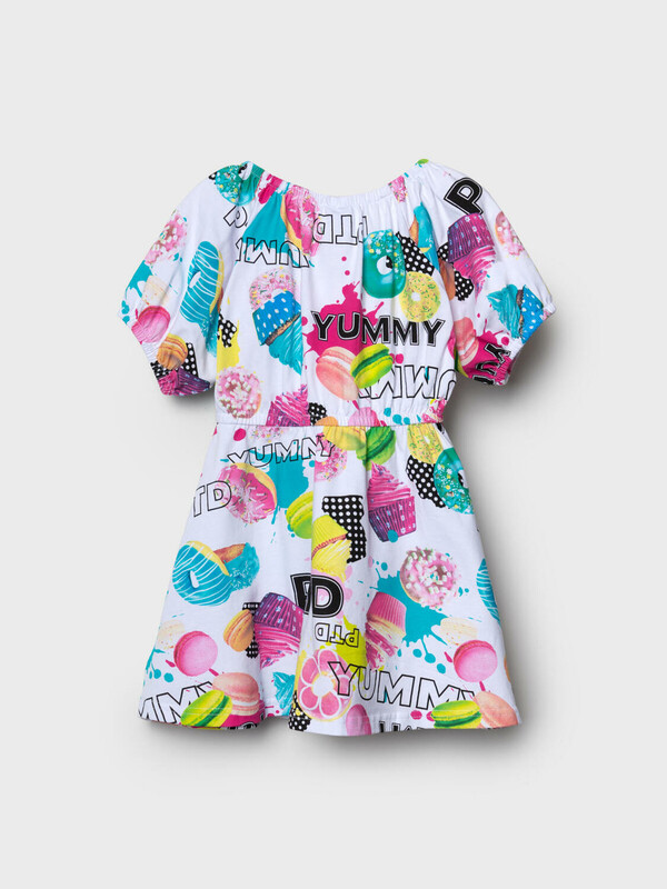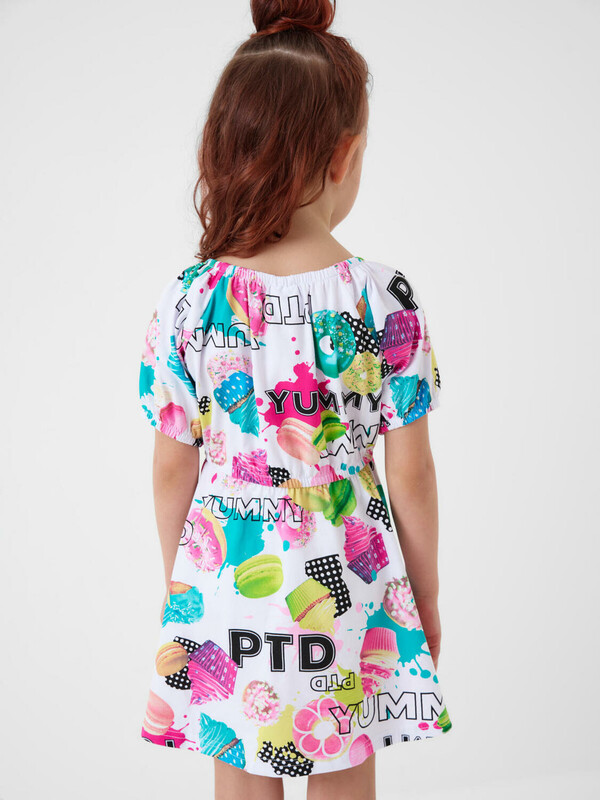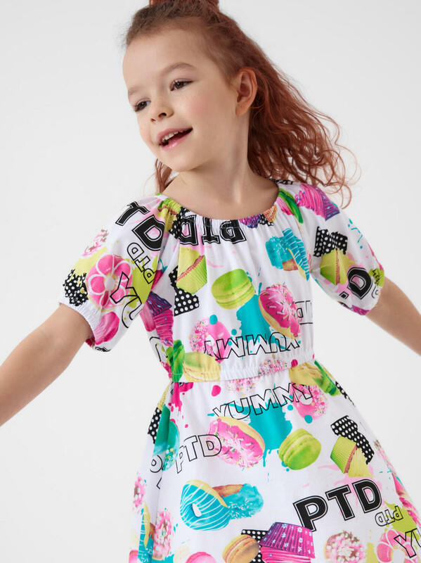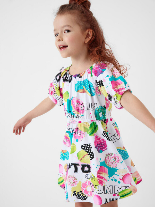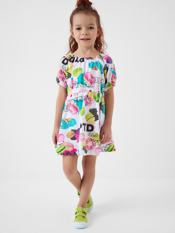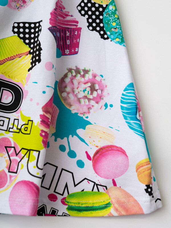 Яркое детское платье для девочки. Модель с короткими рукавами выполнено из хлопкового мягкого трикотажа джерси. Оно имеет свободный силуэт, приталено за счёт внутренней резинки на талии, что делает посадку комфортной. Рукава собраны по низу, а горловина аккуратно обработана эластичной резинкой. Платье украшено красочным принтом — с изображением капкейков, конфет, макарунов и ярких надписей. Платье длиной чуть выше колена.
