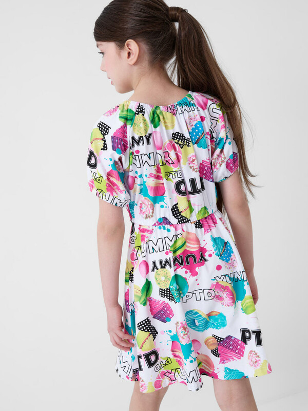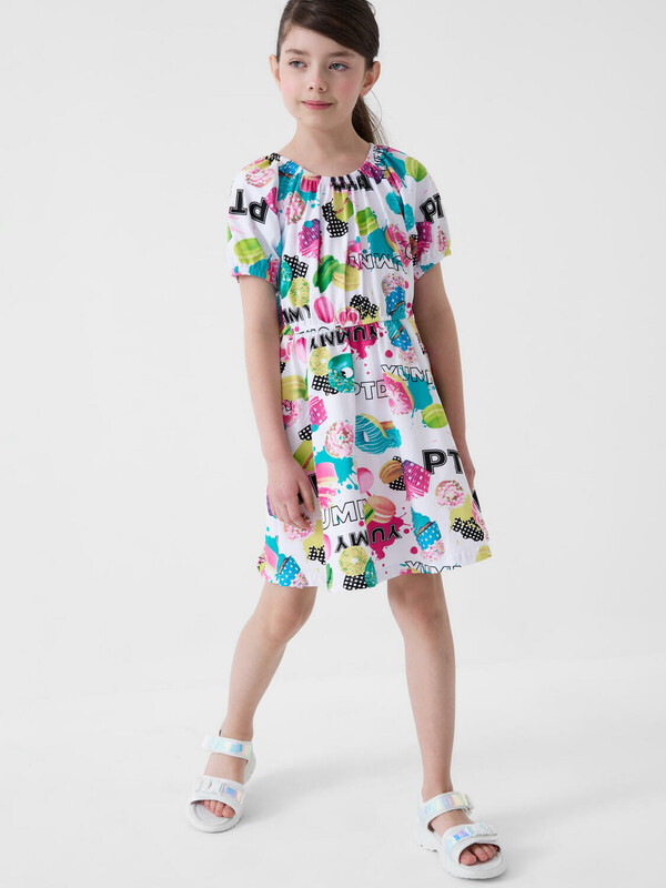 Яркое платье для девочки подростка. Модель из мягкого хлопкового трикотажа джерси с короткими рукавами и круглым вырезом. Украшено красочным принтом по всей поверхности — с изображениями капкейков, макарунов, пончиков и конфет, дополненных текстами и графикой. Платье средней длины, свободного кроя, с эластичной вставкой на талии для удобной посадки. Рукава и вырез оформлены мягкой внутренней резинкой.