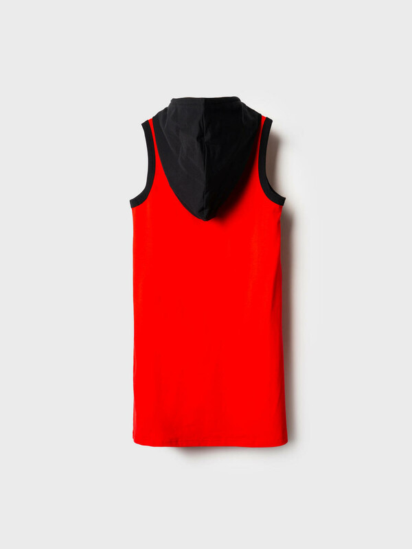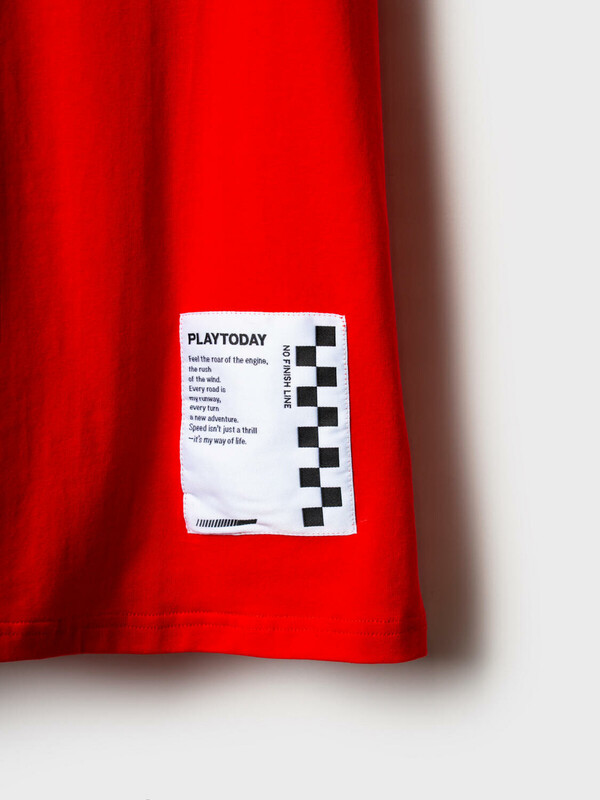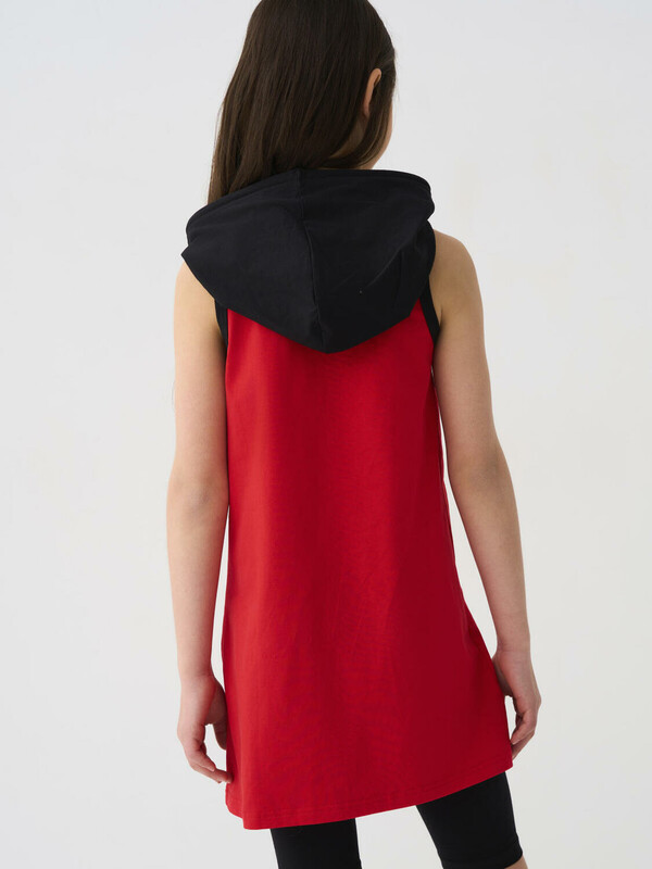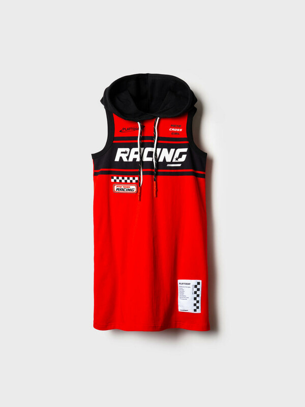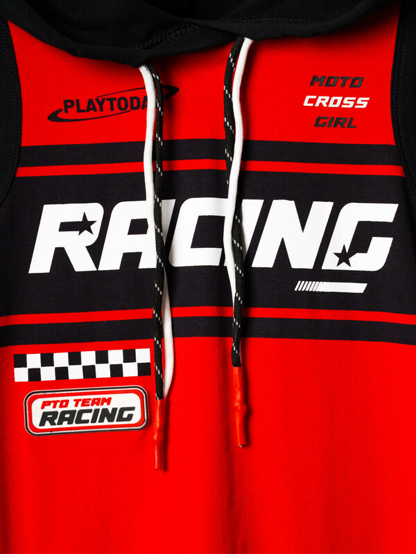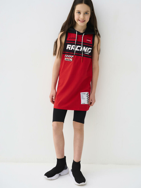 Платье в спортивном стиле для девочки подростка. Модель выполнена в прямом силуэте средней длины и дополнена капюшоном с регулировочным шнуром. Материал — мягкий и эластичный хлопковый трикотаж джерси. На груди — крупный контрастный принт, тематические гоночные надписи и элементы в виде флага. В нижней части — декоративная нашивка с графикой. Капюшон на подкладке с удобной посадкой.