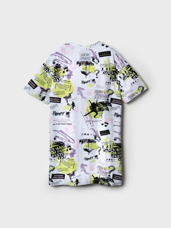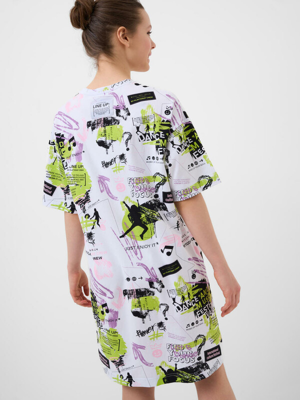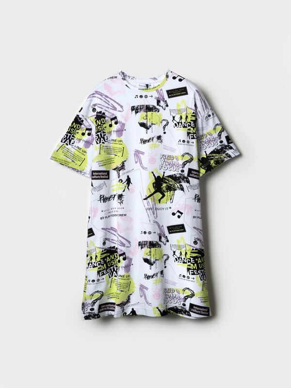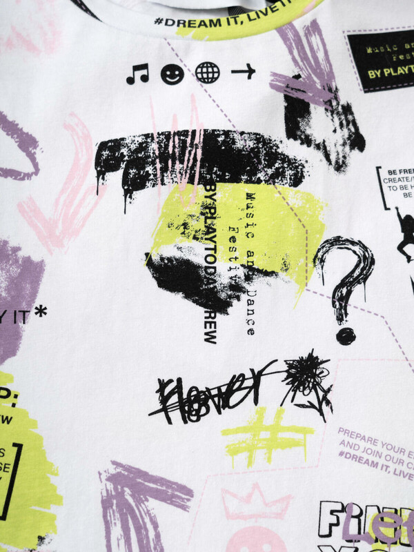 Платье-футболка оверсайз для девочки подростка. Модель длиной чуть выше колена, выполнена из хлопкового трикотажа джерси. Сзади декоративная нашивка. Яркие принты в стиле граффити.