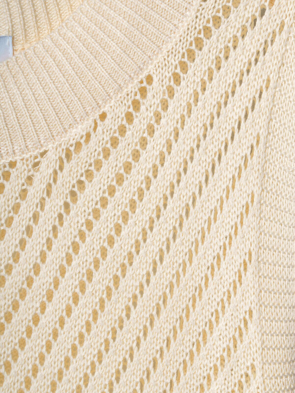 Женская пляжная туника из легкого ажурного трикотажа. Модель без рукавов, с круглой горловиной и свободным прямым кроем, длиной до щиколотки. По бокам предусмотрены разрезы, что добавляет изделию лёгкости и подвижности. Горловина, проймы и низ изделия обработаны контрастной вязаной отделкой. Идеально подходит для пляжа или летнего отдыха.