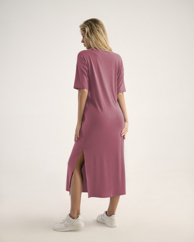 Платье, длина макси с высоким разрезом в левом боковом шве. Спущенное плечо.Втачной короткий рукав. V- вырез.Горловина окантована бейкой из основной ткани.