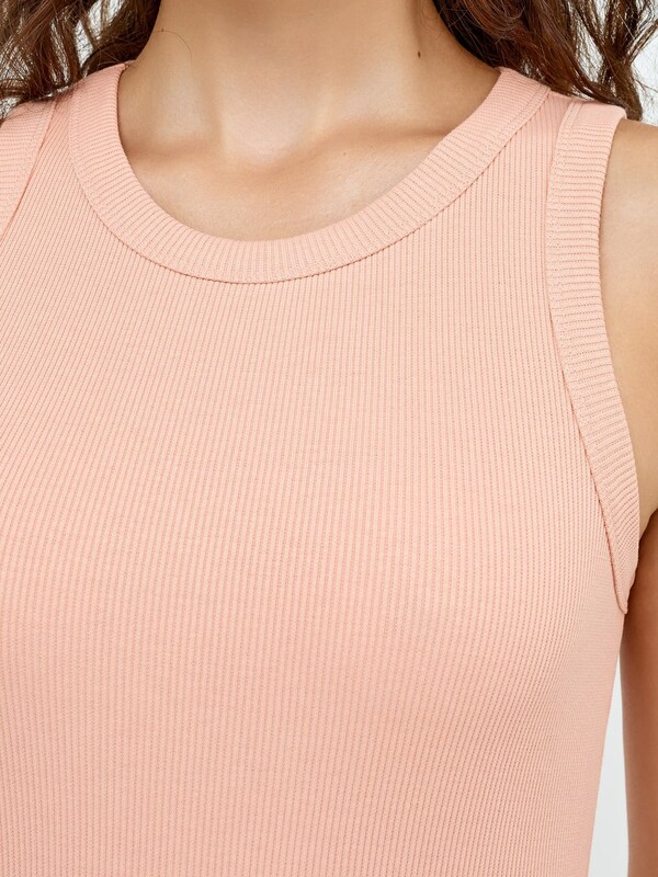 Однотонное женское платье без рукавов длиной выше колена. Прилегающий силуэт акцентирует внимание на достоинствах фигуры. Платье выполнено из трикотажного полотна рибана – в рубчик. Вырез круглой формы. Отличная базовая модель!