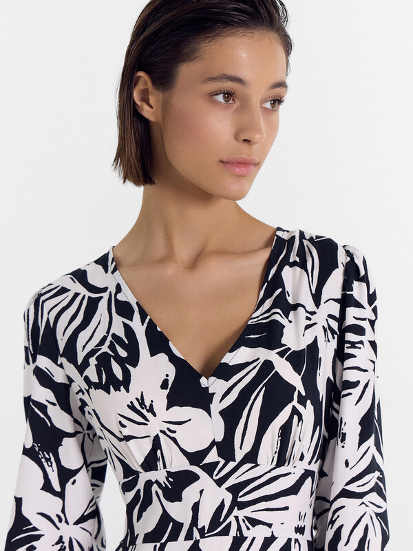 Женское платье полуприлегающего силуэта из нежной и легкой вискозы. Модель акцентирует внимание на талии. Вырез V-образный, с отрезным лифом и сборками по поясу. Рукава длинные, с манжетами и сборками. Длина модели ниже колена, силуэт к низу расширяется. Стильно!