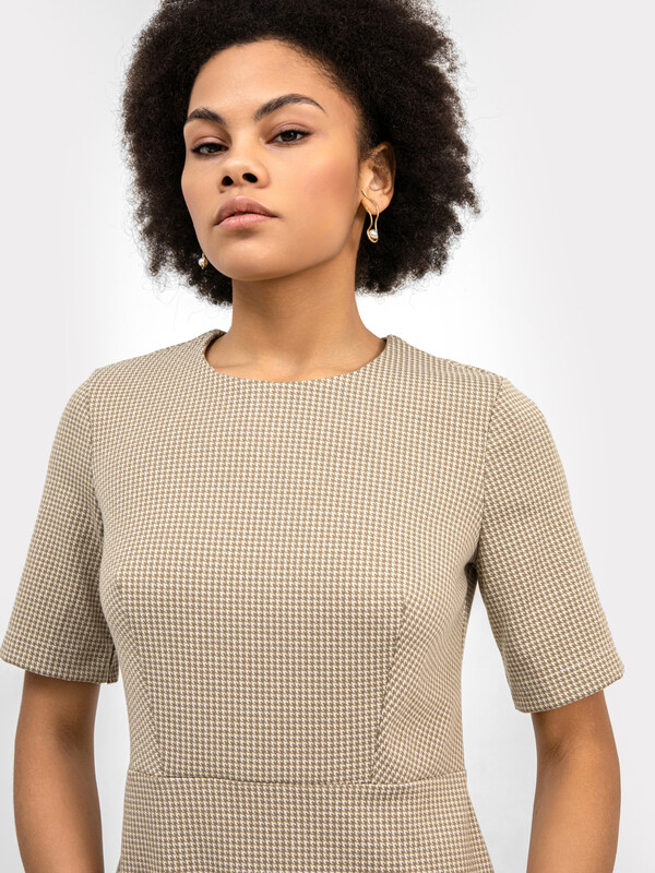 Низ платья А-силуэта, с вытачками на задней детали. Длина ниже колена.