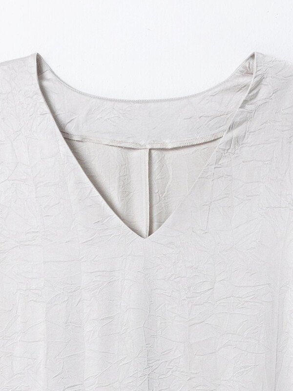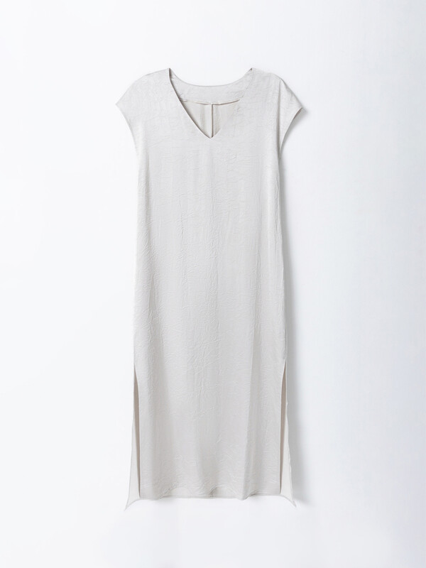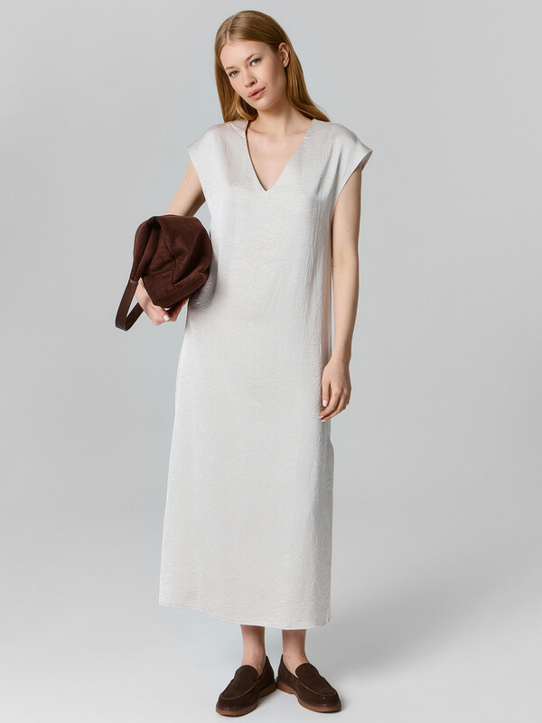 Платье женское прямое. Перед цельнокроеный, по спинке центральный шов. Горловина V-образная, обработана обтачкой из основного полотна. Рукава цельнокроеные. По бокам разрезы. Рукава и низ вподгибку.