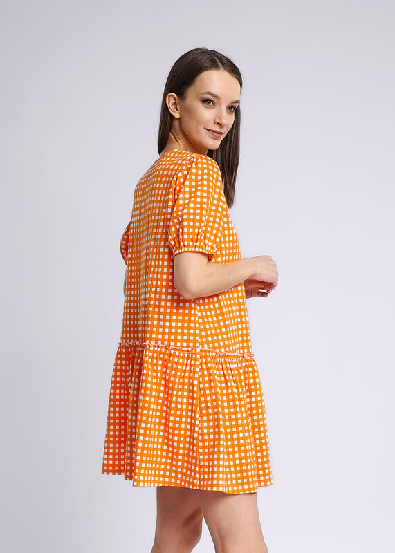 Платье объемное из трикотажного полотна длиной выше колена. Втачной, объемный рукав. Округлая горловина. Орезная юбка.
