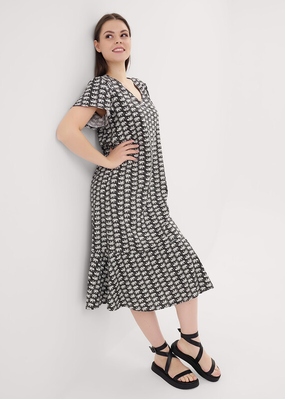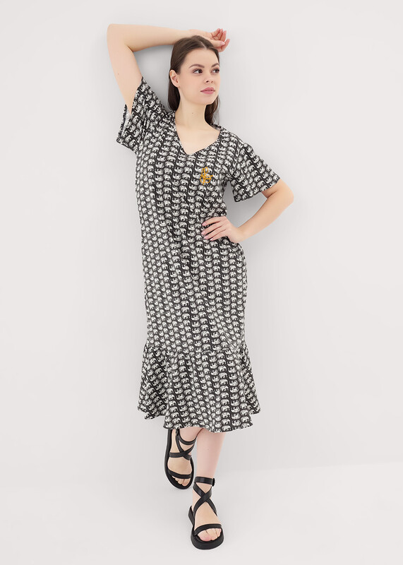 Платье для дома и отдыха из хлопкового трикотажного полотна, А-образного силуэта. Короткй втачной рукав немного расклешенный книзу. V-образная горловина с окантовкой. По низу изделия волан со сборкой. Спереди принт вспенка.