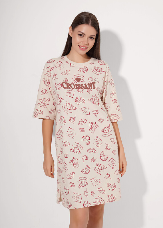 Платье для дома и отдыха прямого силуэта из хлопкового трикотажного полотна. Округлая горловина с обтачкой. Втачной короткий рукав. Спереди принт. Боковые карманы в швах. По бокам разрезы.