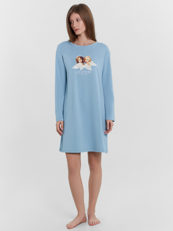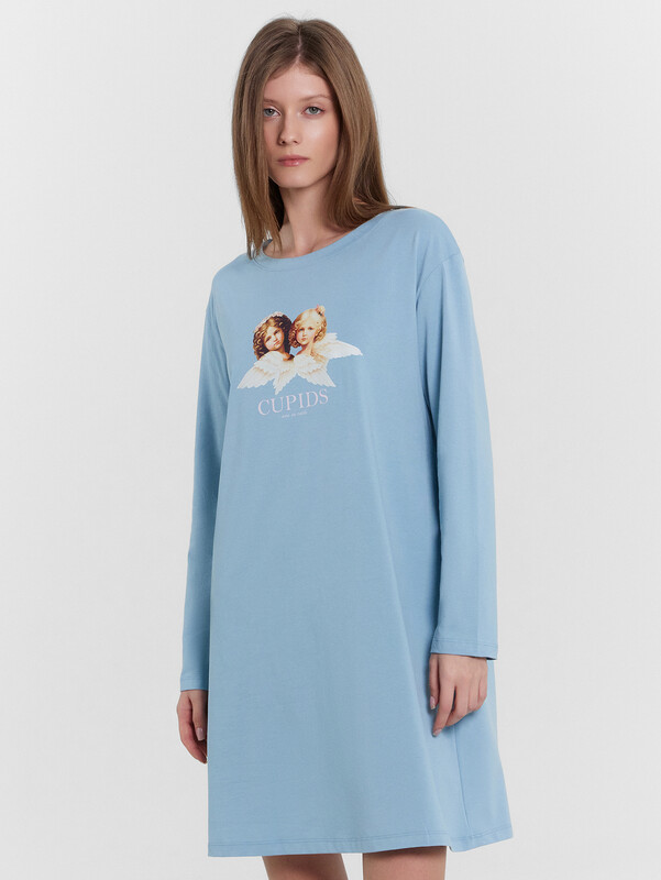 платье женское свободного силуэта. Горловина круглой формы с обтачкой из основного полотна. Рукав втачной длинный, линия плеча немного спущена, рукав обработан вподгибку. Низ застрочен швом в подгибку.