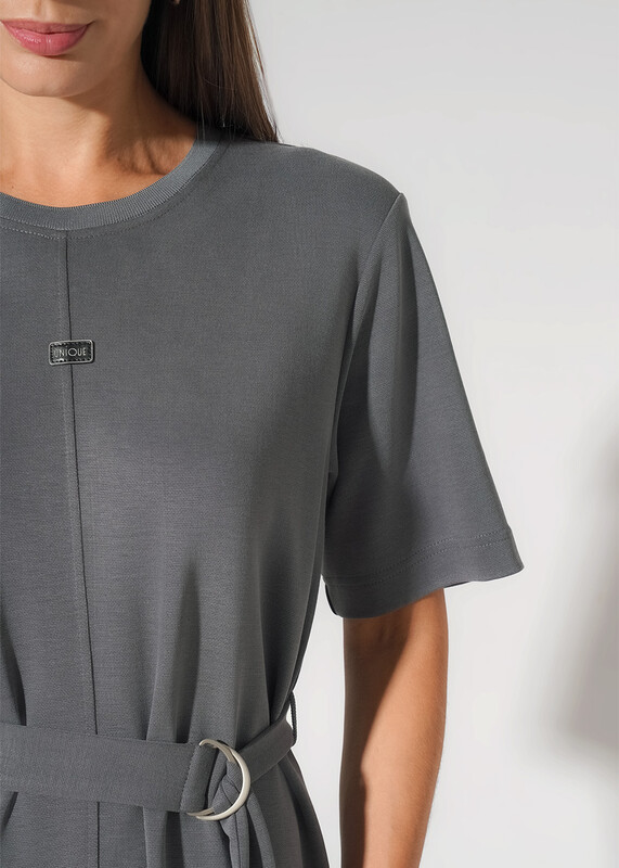 Платье из вискозного трикотажного полотна прямого силуэта. Округлая горловина с вязаной обтачкой. Короткий втачной рукав. Спереди отстроченный средний шов, нашивка. Боковые разрезы. Съёмный пояс с полукольцами, вязаные шлевки.