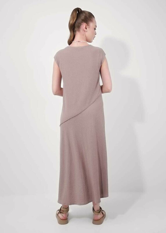Платье без рукавов из фактурного трикотажного полотна джерси,свободного силуэта. Округлая горловина, по горловине и пройме внутренняя окантовка. По переду и спинке фигурные резы, швы наружные - широкий оверлок.