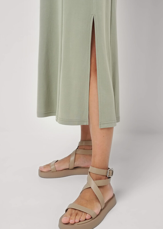 Платье из трикотажного полотна пике, без рукавов А-образного силуэта. Округлая горловина. По плечу хлястики.Спереди рельефы,боковые карманы в швах.На детали спинки средний шов с молнией, рельефы. По горловине и пройме внутренняя обтачка. Боковые разрезы.