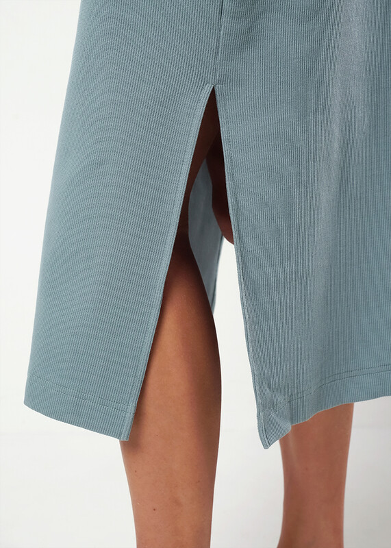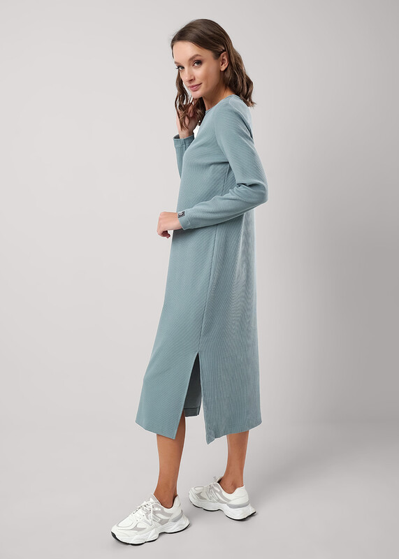 Платье из трикотажного эластичного полотна кашкорсе. Прямого силуэта длиной миди,по бокам разрезы. Округлая горловина с окантовкой. Длинный втачной рукав, внизу нашивка. На спинке принт.