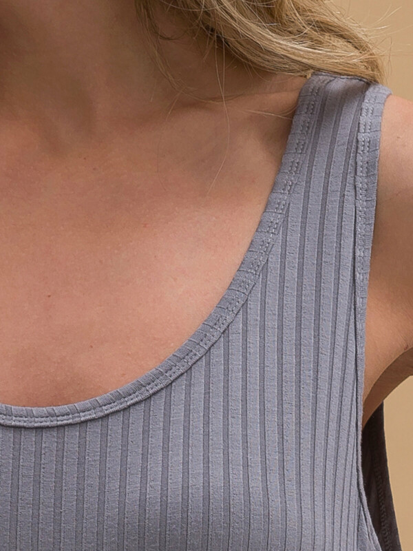 Женское платье-майка из эластичной ткани в рубчик. Ткань отлично растягивается и быстро возвращается в исходную форму, приятна на ощупь и проста в уходе. Платье на широких бретелях свободного кроя с увеличенными проймами – стильное, спортивное, комфортное. Боковые разрезы снизу для легкого акцента на ноги. Удобно спать, заниматься повседневными делами и просто быть собой.
