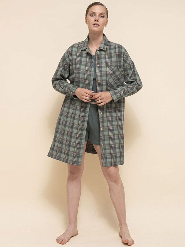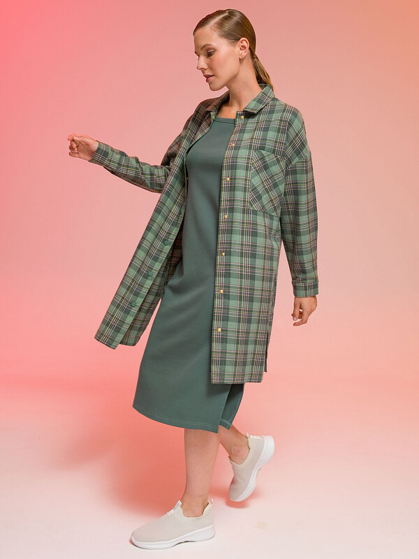 Женское тёплое платье-рубашка из фланели. Домашняя одежда из фланели в клетку — один из актуальных трендов этого сезона. Халат-рубашка женский оверсайз-силуэта со спущенным плечом подарит вам ощущение комфорта и уюта. Платье с длинными рукавами застёгивается на кнопки спереди по всей длине. Изделие дополнено классическим рубашечным отложным воротником и удобным накладным карманом для мелочей на груди. Рубашка лаконичного дизайна, без принта. За ней легко ухаживать. В составе 100% высококачественного хлопка — платье тёплое, мягкое и отлично дышит. Халат фланелевый представлен в красивом зелёном цвете. Размерная линейка: XS (42); S (44); M (46); L (48); XL (50). Такая рубашка подходит женщинам, девушкам, девочкам-подросткам с любым типом фигуры. Отличное платье на осень, зиму и весну для дома и отдыха. Платье свободного кроя с длинным рукавом — прекрасный подарок для мамы или сестры на Новый год или любой другой праздник.