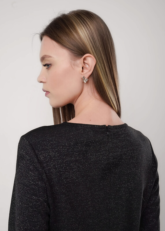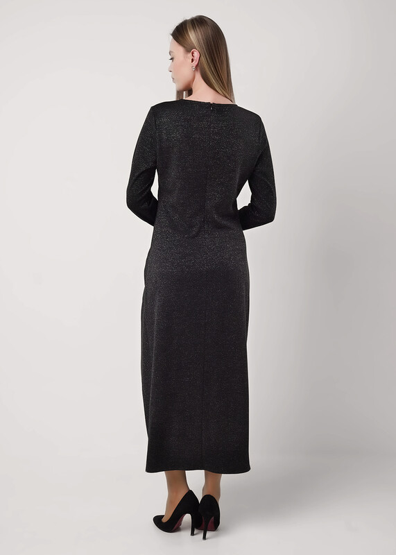 Платье полуприлегающего силуэта из трикотажного полотна с блеском. Округлая горловина. Длинный втачной рукав, по низу рукава разрезы. По переду рельеф со сборкой на резинку и разрезом. По спинке средний шов с застёжкой на молнию.