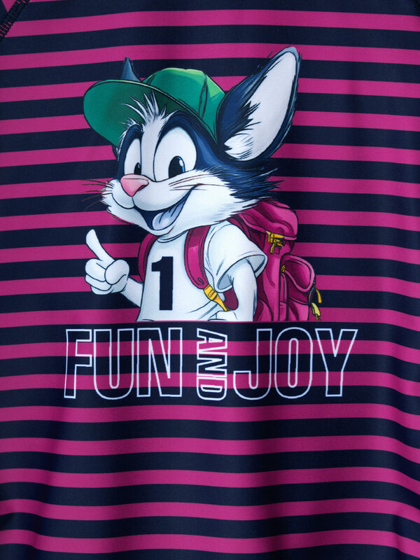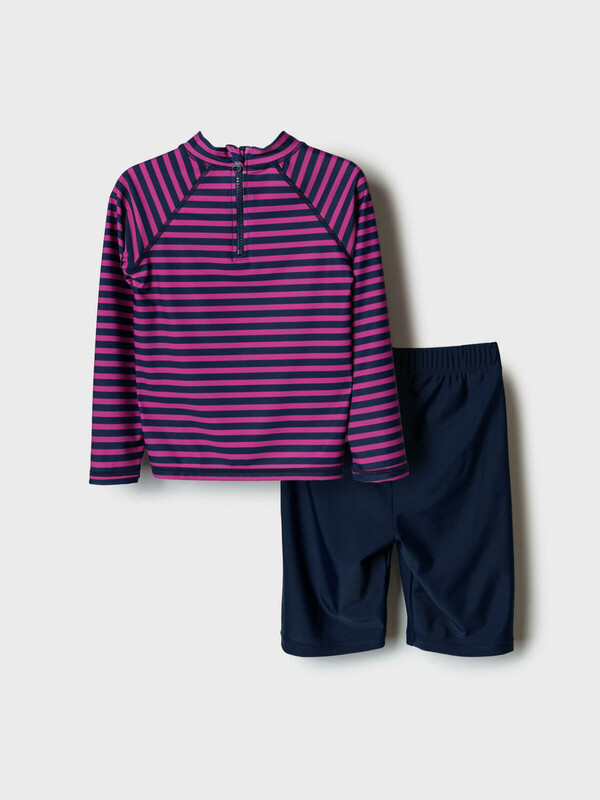 Детский плавательный комплект из лонгслива и шорт для мальчика. Верх — с длинными рукавами, высоким воротничком и застёжкой на молнии сзади. На груди — крупный принт. Шорты тёмно-синие, с мягкой резинкой на талии и декоративным шнурком. Все швы сделаны плоскими — для удобства и комфорта в носке. Отличный вариант для активного отдыха или пляжа.