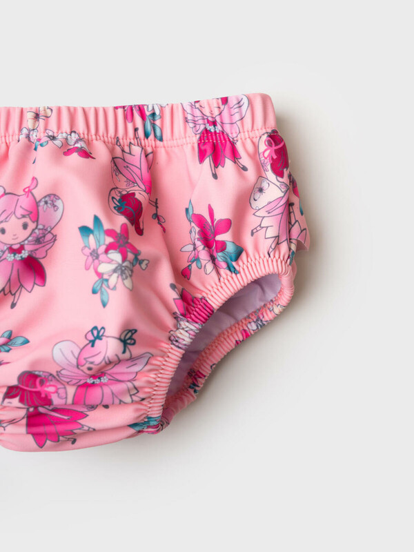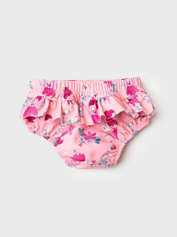 Плавки детские для девочки разработаны специально для ношения с подгузником. Модель выполнена из розовой эластичной ткани с милым принтом сказочных персонажей и цветов. На спинке изделия — декоративная оборка, придающая очаровательный и нежный вид. Пояс и вырезы ножек оформлены мягкими резинками для комфортной посадки. Внутри предусмотрена наклейка в области ластовицы для дополнительной гигиены. Отличный выбор для пляжного образа малышки.