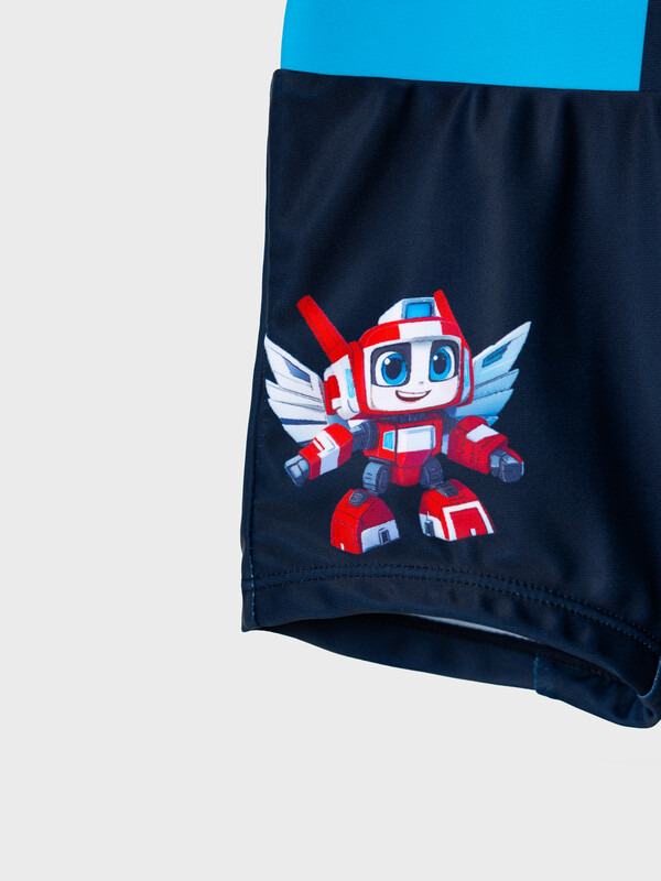 Плавки-шорты детские средней длины, прилегающего силуэта для мальчика. Изготовлены из эластичного трикотажа, с подкладкой для большего комфорта. Ткань устойчива к солнцу и солёной воде, благодаря UF-защите сохраняет насыщенность цвета и структуру волокон. В поясе — удобная резинка и регулируемый шнурок.