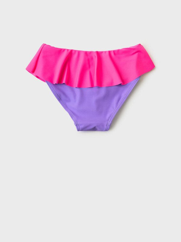 Купальные детские плавки для девочки. Модель с низкой посадкой, выполнена в сиреневом цвете с широким розовым воланом по талии. Для удобства в поясе вшита эластичная резинка, а вырезы для ножек обработаны мягкой латексной резинкой. Внутри предусмотрена ластовица с подкладкой. Благодаря UF-защите, ткань сохраняет первоначальный вид даже при длительном пребывании на солнце. Подходит для плавания и активного отдыха.