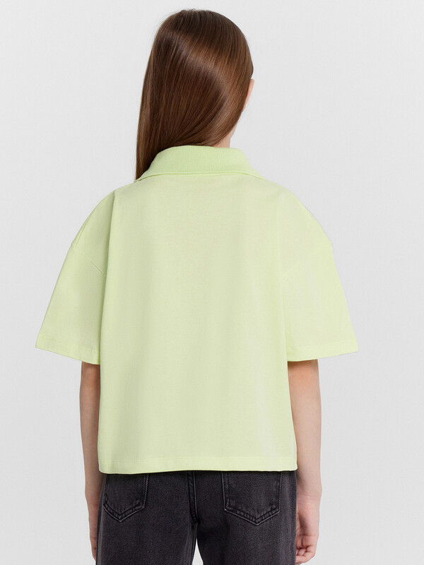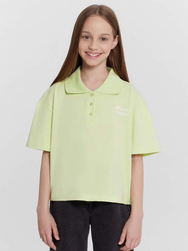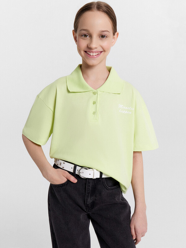 Поло для девочек свободного силуэта с воротником из довяза. На детали переда обработана планка с 3 пуговицами d=10mm, горловина круглой формы. Плечо спущено, пройма слегка углублена. Рукав втачной, короткий.