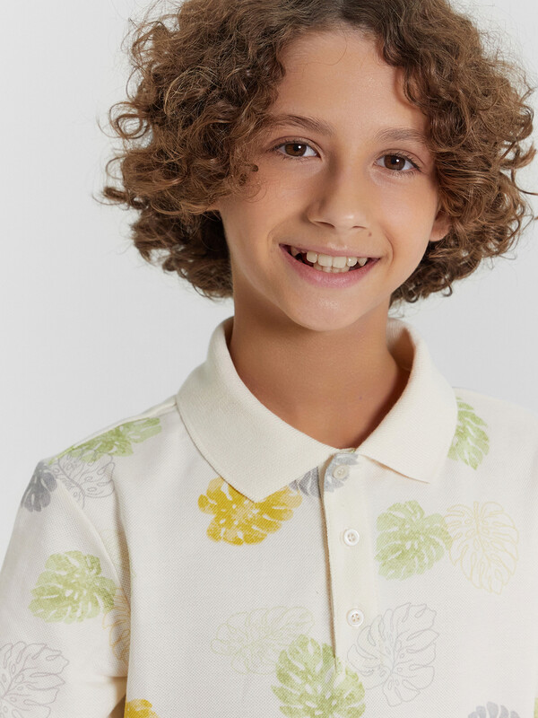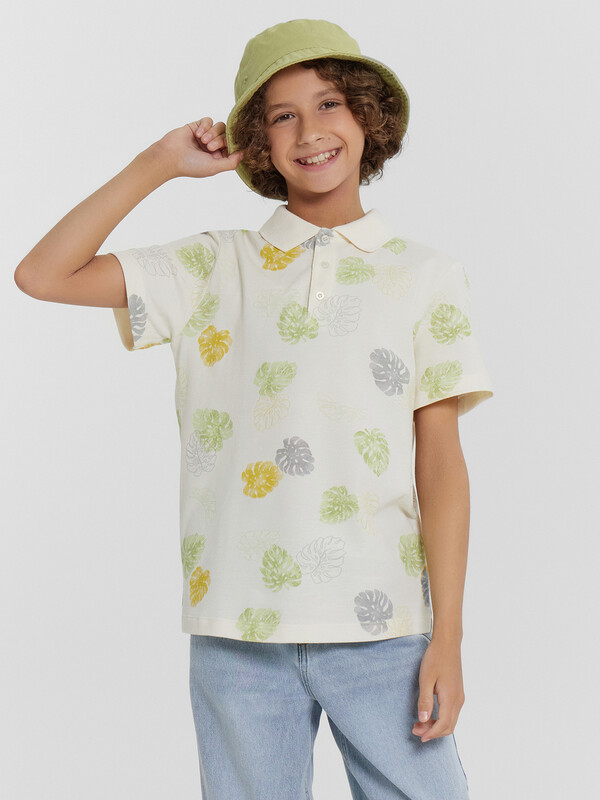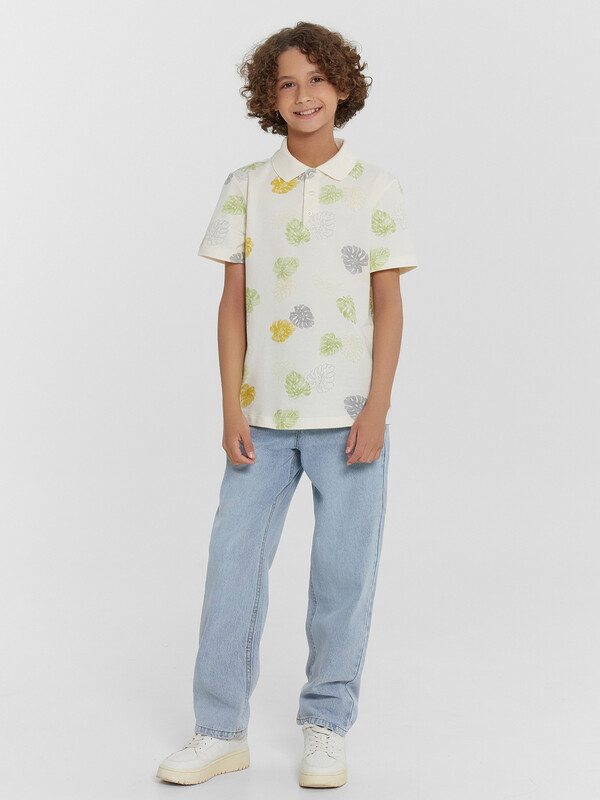 Силуэт прямой. Перед, спинка цельнокроеные. По переду изделия выполнен разрез на застежку на 3 вертикальные петли и пуговицы. В горловину втачен готовый воротник (довяз). Припуск шва втачивания воротника в горловину по спинке окантован бейкой, настроченной по перегибу на спинку между плечевыми швами. Рукава короткие одношовные. Низ изделия и рукавов обработаны швом в подгибку.