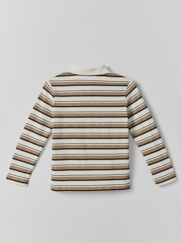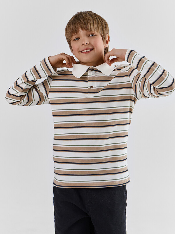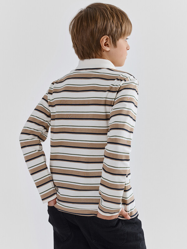 Поло для мальчиков прямого силуэта. Рукава втачные длинные. Плечо слегка спущено. Горловина округлый формы с рубашечным воротником из довяза DOV-16, DVC-85/001-0/5 . Шов обработки горловины - закрыт х/б тесьмой 10 мм 10TGY-O. По переду обработана застежка на петли и пуговицы d=10 mm.